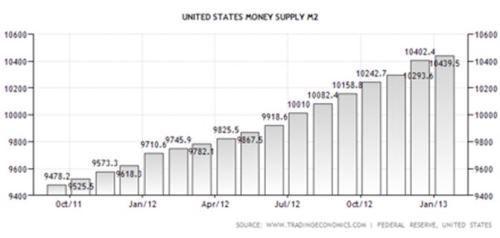 We can reasonably expect the money supply to continue to increase, so long as the Federal Reserve keeps increasing the monetary base at a rate of $85 billion per month. These increases in the monetary base and in the M2 money supply have not yet been reflected in the CPI, but they eventually will.